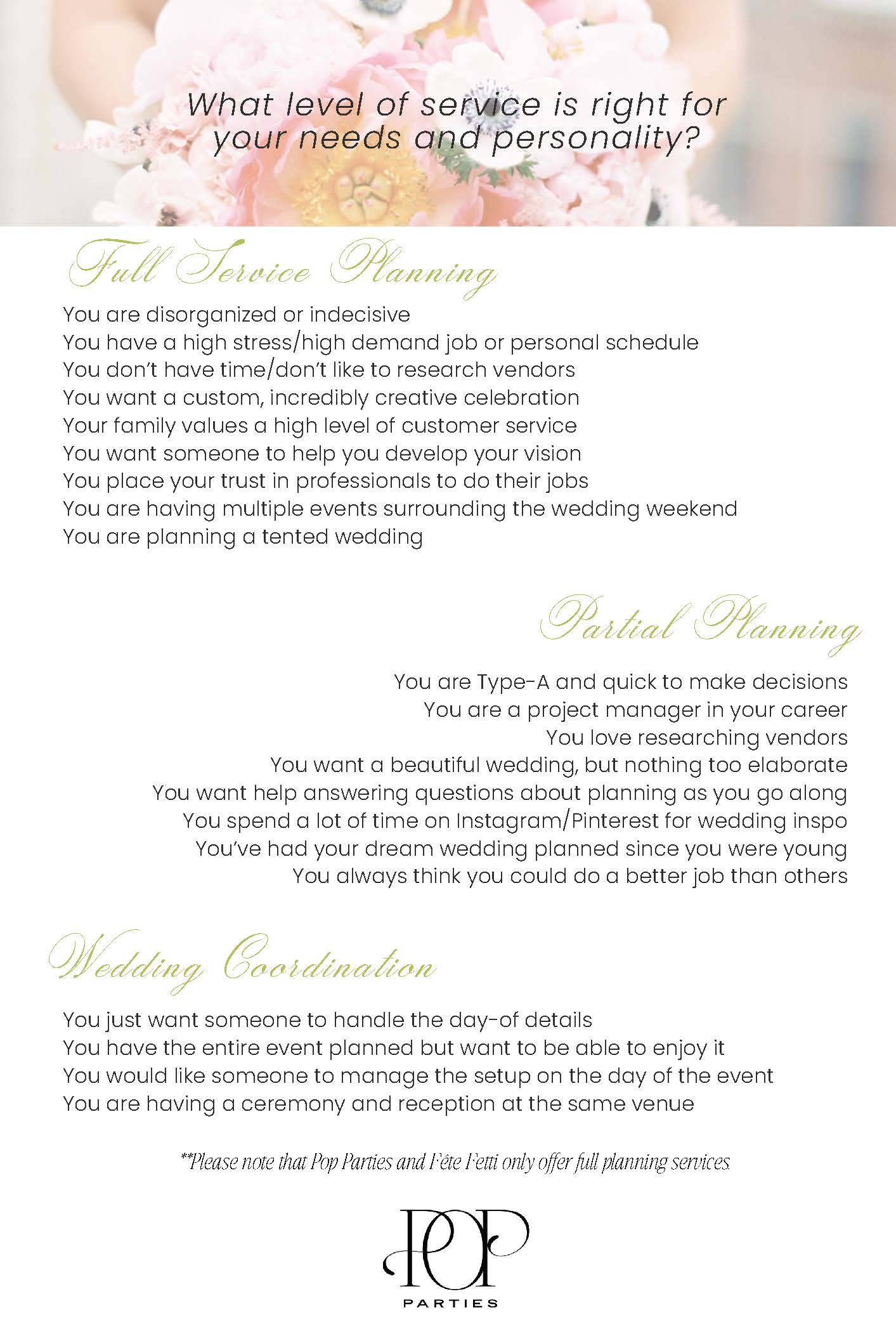 Finding the perfect vendors can be extremely overwhelming. With so many beautiful Instagram pages, it’s hard to know where to begin. You want someone who is reliable, trustworthy, and understands your vision for the big day. Many of you are currently searching for your wedding planner, and although we would love to assist you – we want to make sure you find the perfect fit for the big day, even if it isn’t here at Pop Parties. Here, you’ll find some tips on how to select your wedding planner for your celebration.