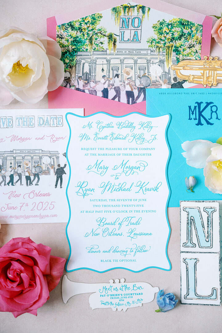 In contrast, this suite was designed for a bride who originally thought she wanted something more traditional. But since she was getting married in New Orleans, we suggested she lean into the vibrant location and let the stationery reflect that. She trusted our advice and was absolutely in love with the colorful, playful NOLA-inspired suite! I had so much fun with the shapes and fonts, challenging myself to create something totally unique.
